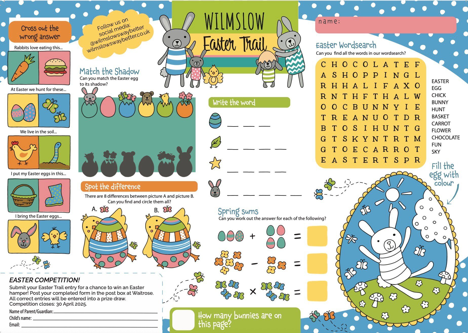 Once you have completed your Easter Trail entry, you are in with a chance to win an Easter hamper. The completed form should be posted in the post box at Waitrose. Closing date as 30 April 2025.